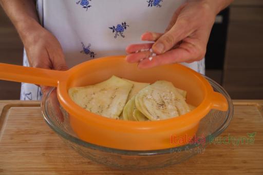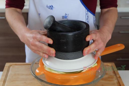 Dobrovolný krok: Přikryjeme talířem a zatěžkáme. Necháme lilky odležet alespoň 1 hodinu, aby uvolnily tekutinu. Poté plátky důkladně opláchneme od soli a osušíme kuchyňským papírem...