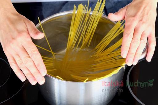 Nyní si připravíme těstoviny: ve větším hrnci přivedeme k varu osolenou vodu, vsypeme těstoviny, zamícháme a uvaříme al dente. Postupujeme podle návodu výrobce...