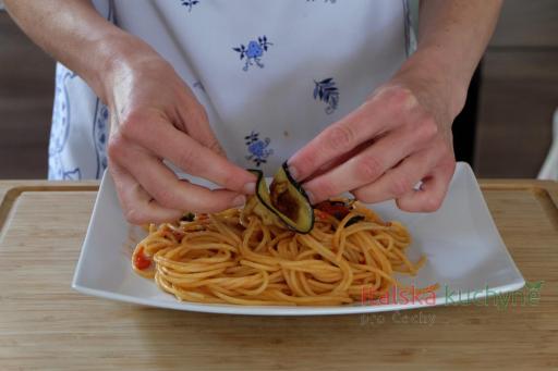 Lilky nakrájíme na nudličky (pár plátků necháme stranou na ozdobení) a přidáme k rajčatové omáčce. Pár minut povaříme, aby se chutě dobře propojily. Dosolíme podle chuti...