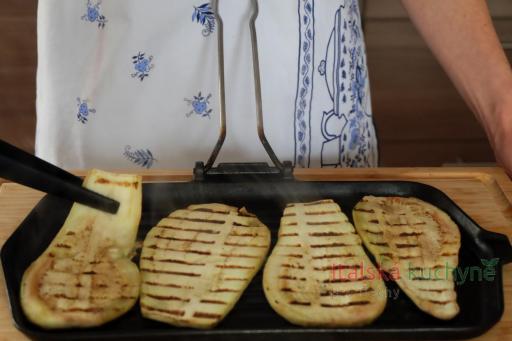 Grilovací pánev dobře rozehřejeme a lilek ogrilujeme z obou stran (nejlepší je elektrický sendvičovač, který opeče lilek hned z obou stran a ušetří nám tím čas)...