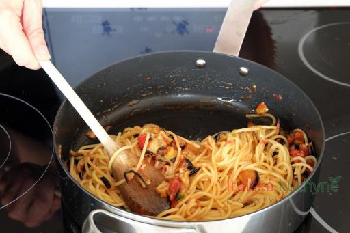 Uvařené těstoviny scedíme, přidáme k omáčce a promícháme...