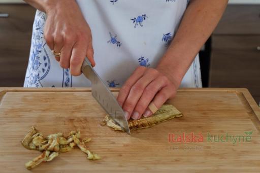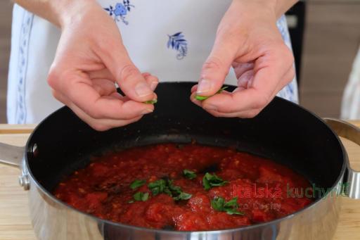 Hotovou omáčku odstavíme z ohně a přidáme bazalku naškubanou prsty...