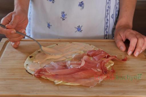 2) Tuňák, čerstvý salát, omáčky a syrové uzeniny, jako prosciutto crudo, bresaola a špek se přidávají až poté, co se piadina ohřála.