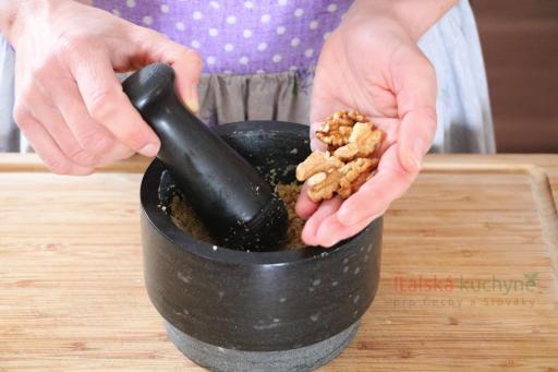 Část ořechových jader a česnek vložíme do hmoždíře a důkladně rozmačkáme. Pokud nemáme hmoždíř, ořechy můžeme namlít anebo rozmixovat...
